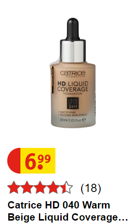 Hier heb je de ‘Catrice Liquid Coverage’. Dit is een variant van de foundation van Estée Lauder en je kan ze in elke Kruidvat terugvinden. Bij dit product vind ik dat de prijs niet gelinkt mag worden met de kwaliteit. Ik heb hem zelf ook een tijdje gebruikt en was er tevreden van. Het is een redelijke kwaliteit alhoewel het niet duur is.
