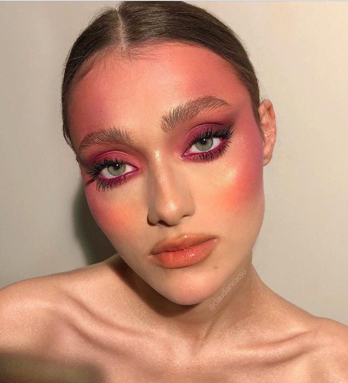 In deze makeup look zitten eigenlijk alleen peachy, roze en bronze kleuren. De rest bestaat uit highlight. Wat deze look compleet maakt is dat er niet alleen oogschaduw gebruikt is op de ogen maar dezelfde oogschaduw is gebruikt als contouring.